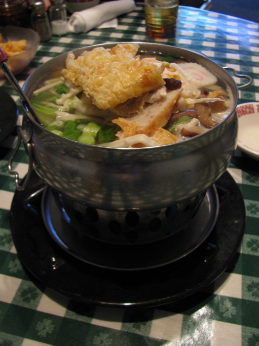 San Su’s shabu shabu was much closer to what I was expecting. A pan of mild broth (which seems more like the Japanese than Korean version of the dish), a plate of beef, vegetables (napa cabbage, chrysanthemum leaves, mushrooms, spinach, enoki mushrooms, scallions, zucchini, carrots), udon noodles and a dipping sauce. The benefit of being at a Korean restaurant was the addition of a raft of banchan dishes which added some variety to the meal.
