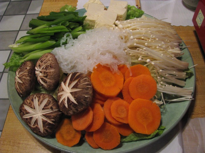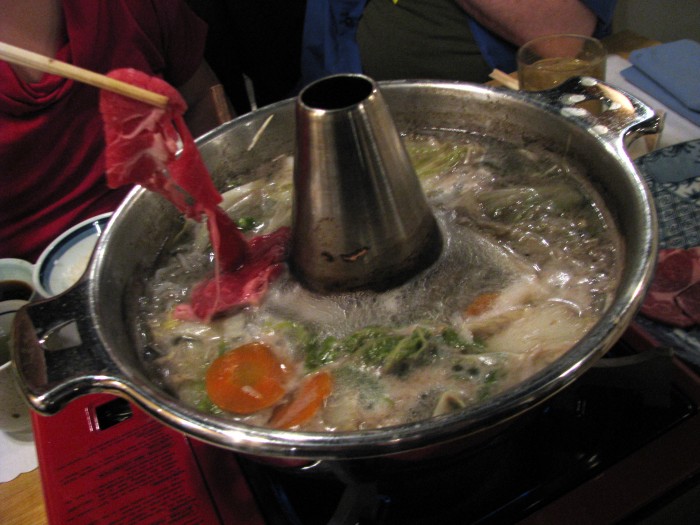 Finally we found a Japanese restaurant that was offering shabu shabu so that we could experience it Japanese style. Ba Sho is a small Japanese restaurant off Sawmill Road in Dublin with private tatami rooms and the largest selection of sake I’ve seen at a Japanese restaurant in Columbus. When we ordered a small camping stove was brought to our table. The pot full of kombu dashi (kelp broth) had a chimney and we waited while the water came to a boil. We were given one plate of beef (pictured above- thicker slices than the beef at San Su) and a separate plate of vegetables (scallions, napa cabbage, carrots, enoki mushrooms, shiitake mushrooms) with rice noodles and tofu (below).