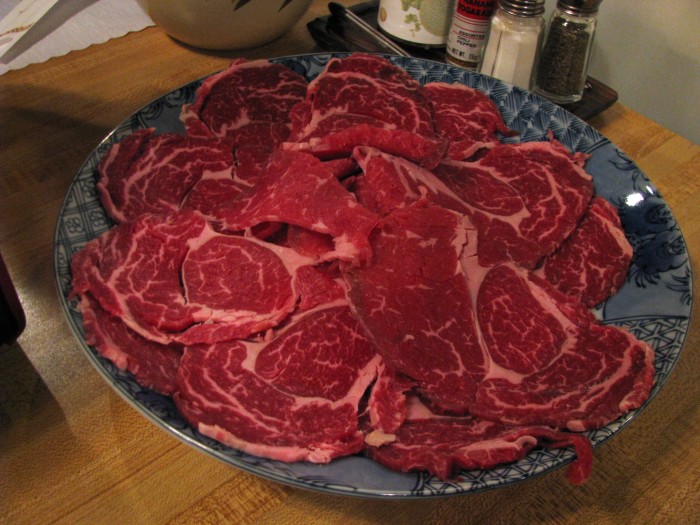 My first experience of shabu shabu in Columbus was at a Chinese restaurant called General Tso’s. We tried both versions of shabu shabu on the menu: seafood (with shrimp, chicken and scallops, pictured above) and the spicy beef (pictured below). The hot pot was accompanied by a plate of dried rice noodles and a raw egg to cook in the stew, but all of the meat and fish was already bubbling away in the pot. Both stews were packed with their respective proteins and vegetables and on top you can see sheets of bean curd that were to be re-hydrated in the stew. They were delicious and satisfying on a cold wintry day, but they weren’t what I was expecting – I suspect these weren’t really shabu shabu but another type of Chinese hot pot.